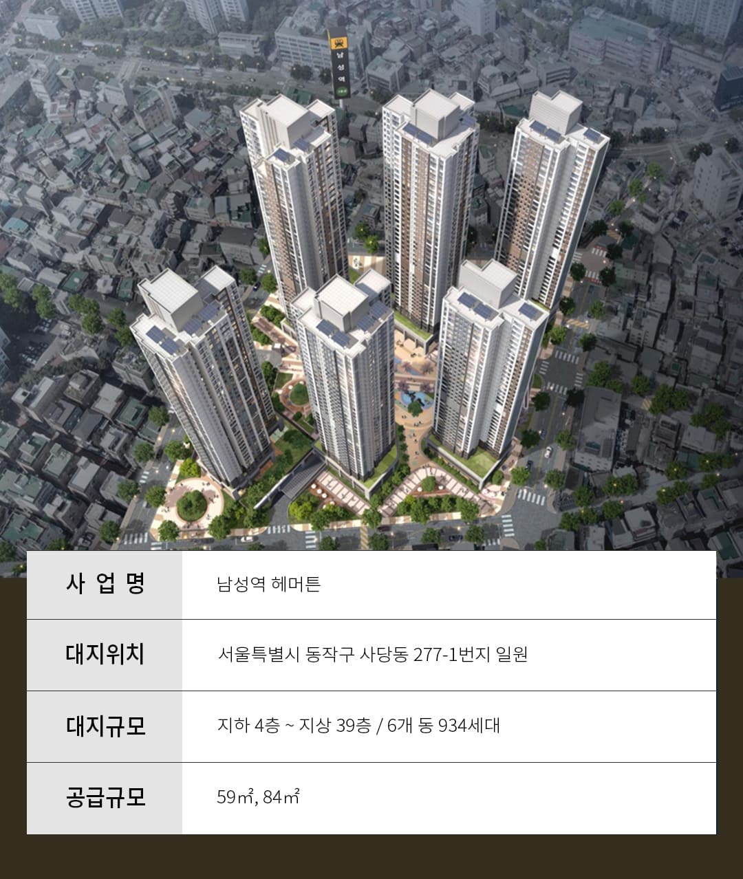 남성역 헤머튼 사업안내 사업개요 입지환경 프리미엄 단지안내 조감도 단지배치도 커뮤니티시설 스마트시스템 세대안내 평면도 고객센터 X namseong hematen 사업개요 location 사당·이수·방배를 넘어 강남까지서울 중심생활권 대단지 랜드마크 아파트 입지환경 Premium 풀옵션 고급 가전제품 기본 제공탁 트인 내부 혁신 특화 설계 프리미엄 UNIT PLAN 머무는 순간부터 휴식이 되는 공간특화설계로 완성한 명품 라이프 59㎡A 59㎡B 84㎡A 84㎡B 세대안내 INTERIOR REGISTER 성함 *전화번호 *010-0000-0000방문/상담 선택 *방문/상담 선택예약방문전화상담유형을 선택해주세요예약예약일시문의사항0 / 180개인정보 수집 및 이용 동의에 체크해주세요 *상담을 위해 기본적인 개인정보 제공에 동의합니다접수하기 관심고객등록 대표문의